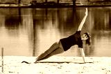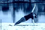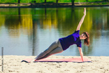 brunette in blue sports shirt on fitness mat doing exercises on beach. Woman doing fitness exercise outdoors