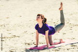 brunette in blue sports shirt on fitness mat doing exercises on beach. Woman doing fitness exercise outdoors