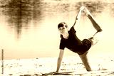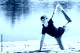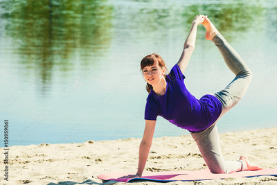brunette in blue sports shirt on fitness mat doing exercises on beach. Woman doing fitness exercise outdoors