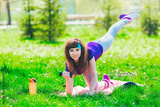 Fitness girl in the park and engaged in various exercises with dumbbell and mat. brunette goes in for sports outdoors