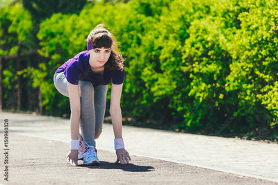 Fitness woman training and jogging in summer park near forest. Ready to start. Healthy lifestyle and sport concept