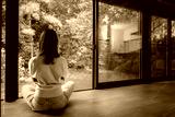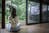 Back view of a woman faceless relaxing on a country porch Image of meditation and concentration