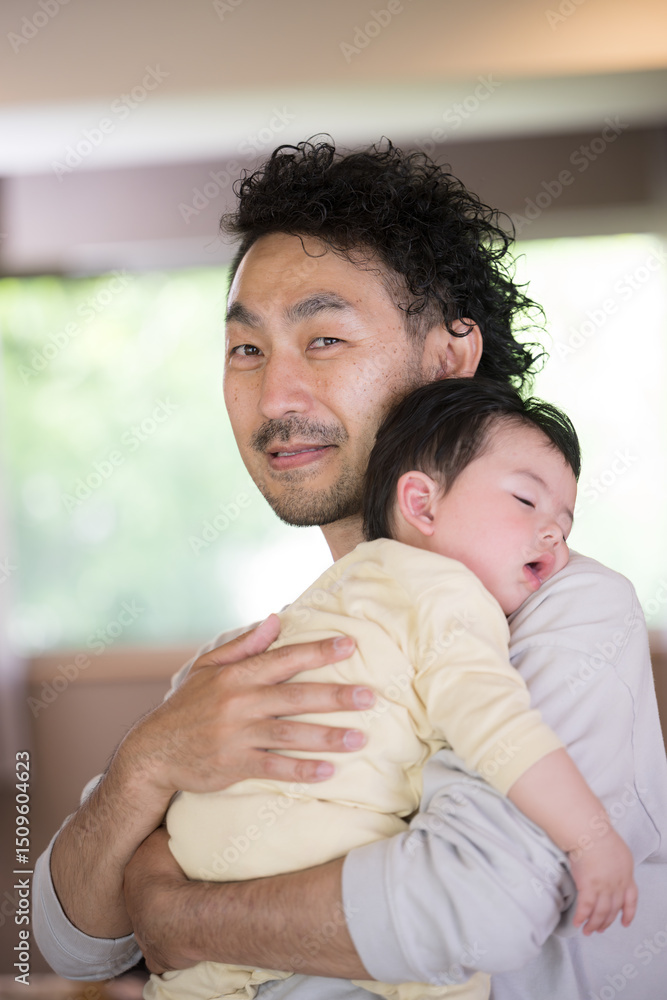赤ちゃんを抱っこして寝かしつけるパパさんのイメージ カメラ目線