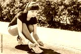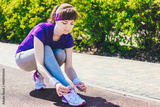 closeup of woman tying shoe laces. Female sport fitness runner getting ready for jogging outdoors on forest path