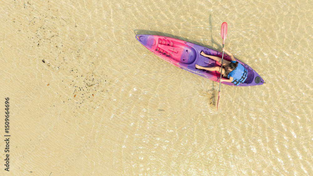 Aerial view of a kayak in the blue sea .man kayaking he does water sports activities.