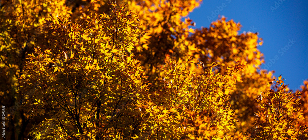 Yellow autumn maple leaves. Sunny autumn day. Fall in nature. Natural autumn fall background. Golden season. Bright orange and red leaf colors. Maple leaves in autumn sunny day.