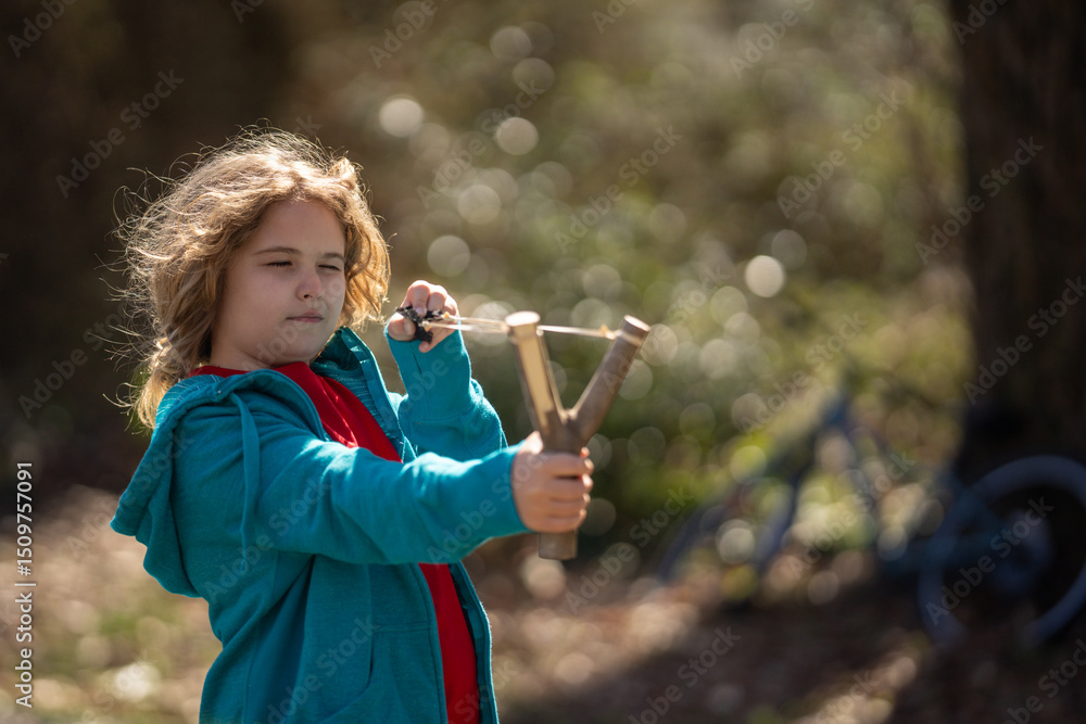 Slingshot in kids hand. Kid holding catapult. Kid aiming with sling. Funny kid playing with slingshot. Handmade wooden slingshot. Kid aiming at target. Boy with slingshot. Kids game with catapult.