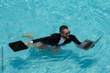 Crazy Business man in suit wit laptop in swimming pool. Crazy summer freelancer working in pool. Funny businessman with laptop on sea beach. Guy enjoying travel and beach. Creative online strategy.