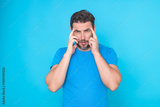 Thougthful thinking man looks pensively aside makes plannings isolated over yellow background. Handsome thinking man considers. Portrait of pensive thinking man. Thoughtful guy thinking decision.
