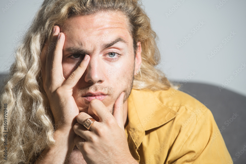 Serious man with hand on face. Close-up of serious man deep in thought. Serious expression. Handsome serious male thinking with doubt. Emotional portrait of stressed guy. Dramatic look.