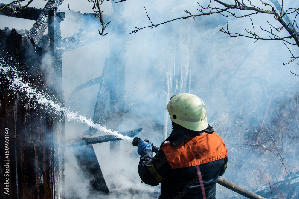 Firefighter put out a fire. Brave firefighter battling house fire blaze. Firemen in uniform in burning fire home. Firefighter uses hose to control fire. Firefighting concept. Firefighter in helmet on