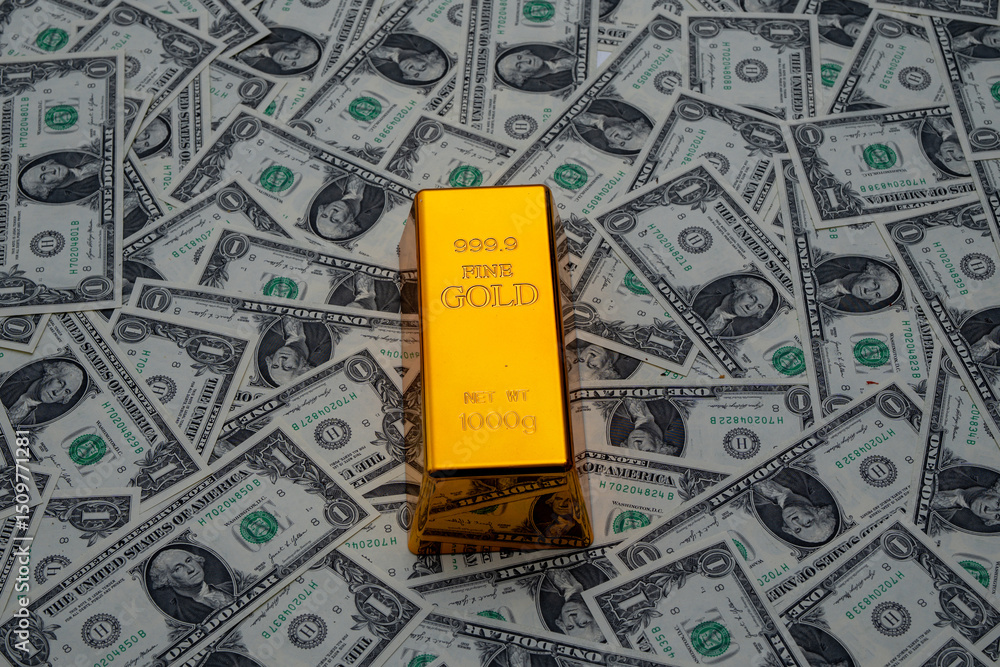 Gold bars. Dollar bills with gold bars. Cash money. Finance and banking concept. Golden bullion. Hundred dollar bills and Gold bars. Treasure chest with currency. Earning money in Gold.