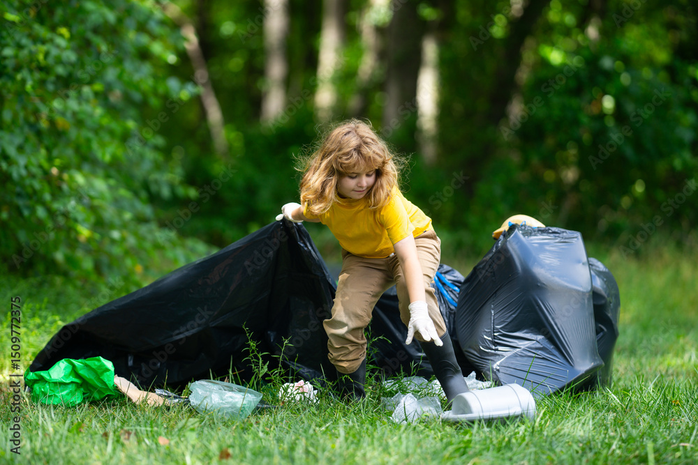 Child picking plastic trash for cleaning the nature. kid Clean up garbage outdoor. Ecology concept. Environment Day. Save earth. Recycling bin garbage. Ecology. Environmental care. Eco kid.