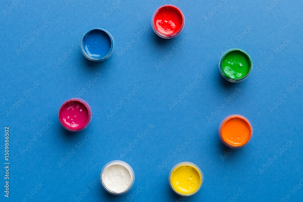 jars with gouache of different colors on Colored background. hobby painting. Top view with empty space. workplace for creativity. home teaching concept drawing