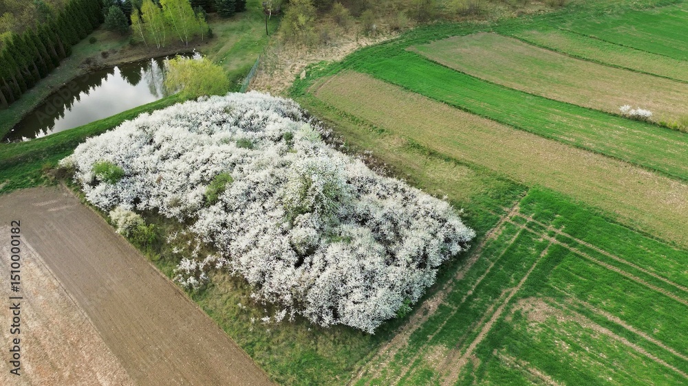 White blossom grove from aerial perspective