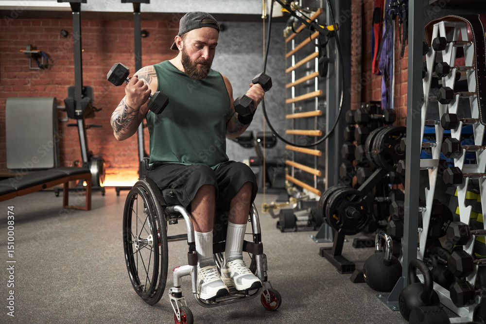 Person in wheelchair using dumbbells while exercising in modern gym setting surrounded by fitness equipment and devices creating an inspiring and motivating atmosphere