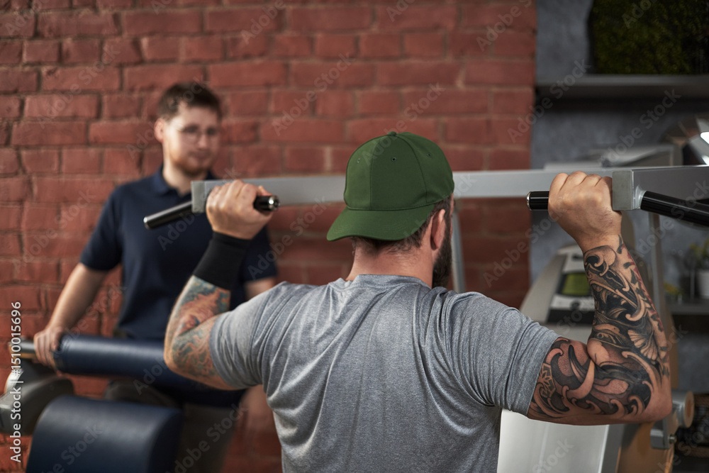 Man lifting weights in gym while another person watches in background. Visible tattoos on arms and a green cap emphasize casual and focused atmosphere