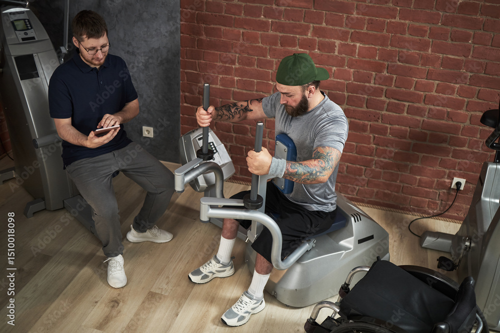 Man with tattoos, cap and beard using gym machine for strength training while personal trainer provides guidance and feedback with notes on tablet in a fitness studio