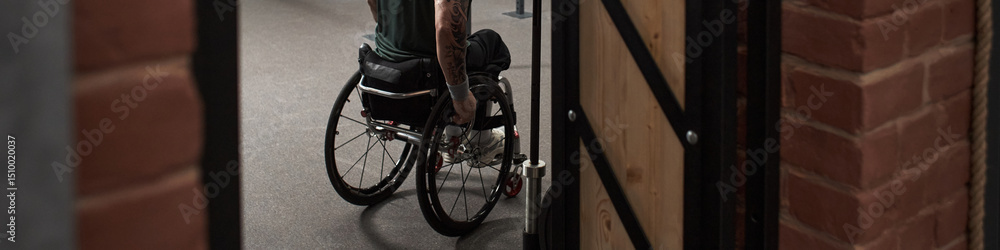 Header with cyclist seen from half-open doorway, highlighting the back wheel and partial view of bike and rider with bricks on either side framing scene