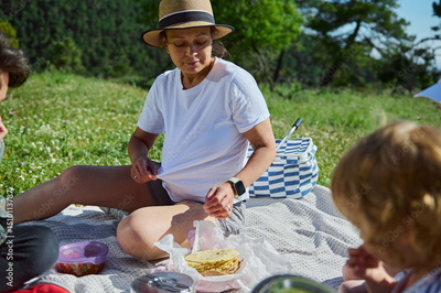Mother Enjoying a Family Picnic in the Mountains on a Sunny Summer Day