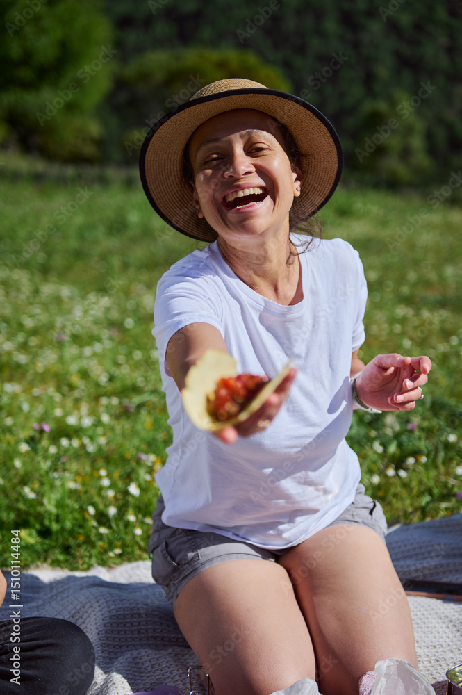 Joyful Mother Sharing a Meal During a Sunny Family Picnic Outdoors