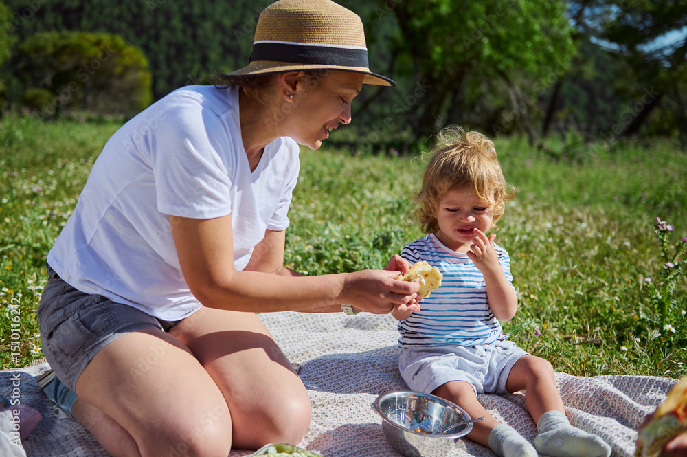 Mother and Child Enjoying a Summer Picnic Together Outdoors