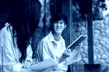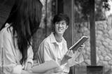 Asian man wearing glasses holding red book and looking at a woman sitting together at wooden terrace
