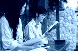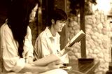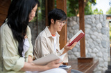 Asian man wearing glasses reading a red cover book while sitting with a woman at wooden terrace.