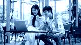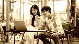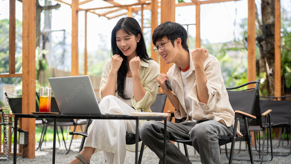 Asian woman and a male friend looking at laptop with happy or excited face at table in garden cafe.