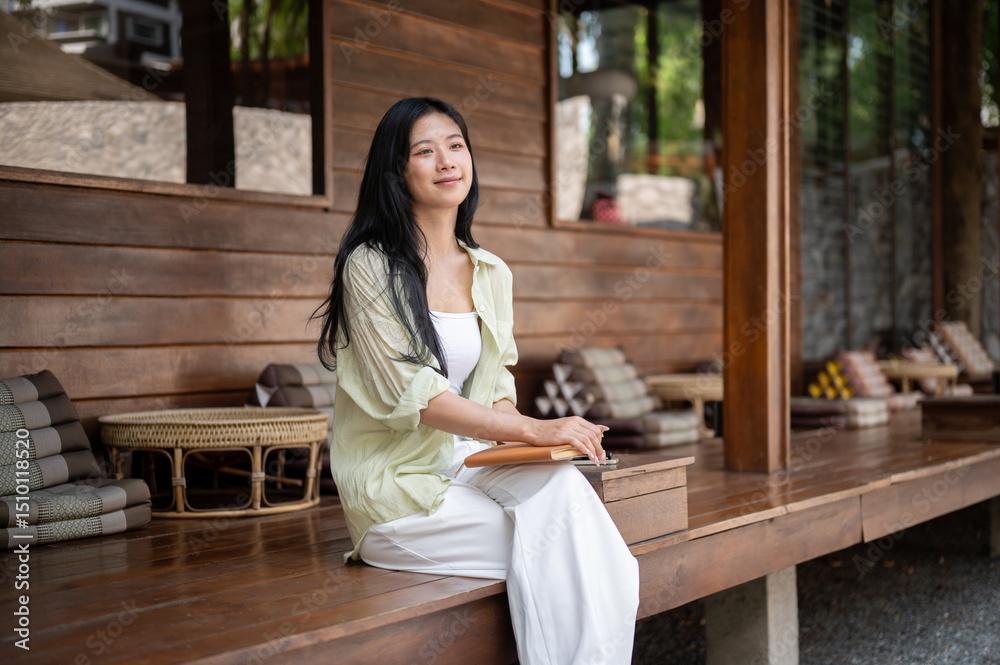 Asian woman is sitting cross lagged and looking ahead with book on her lap at wooden house's terrace
