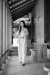 Long hair asian woman is smiling during a phone call while walking in a wooden house's corridor.