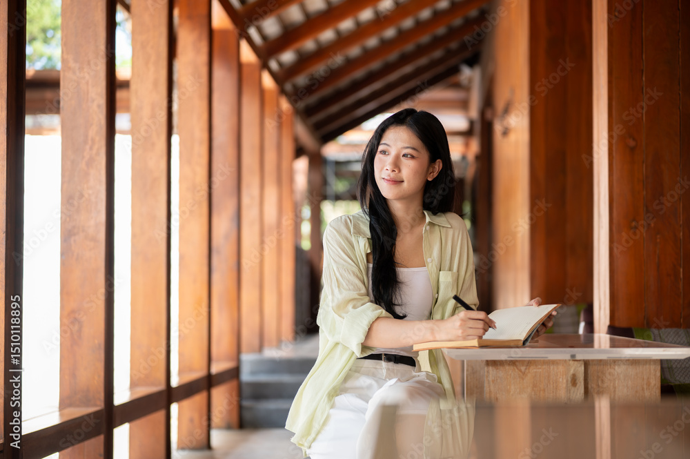 Long hair asian woman holding a pen and looking away from a notebook while sitting in wooden house.