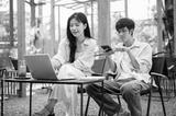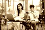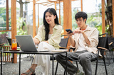 Asian woman smiling and pointing at laptop while male friend holding a phone at table in garden cafe