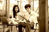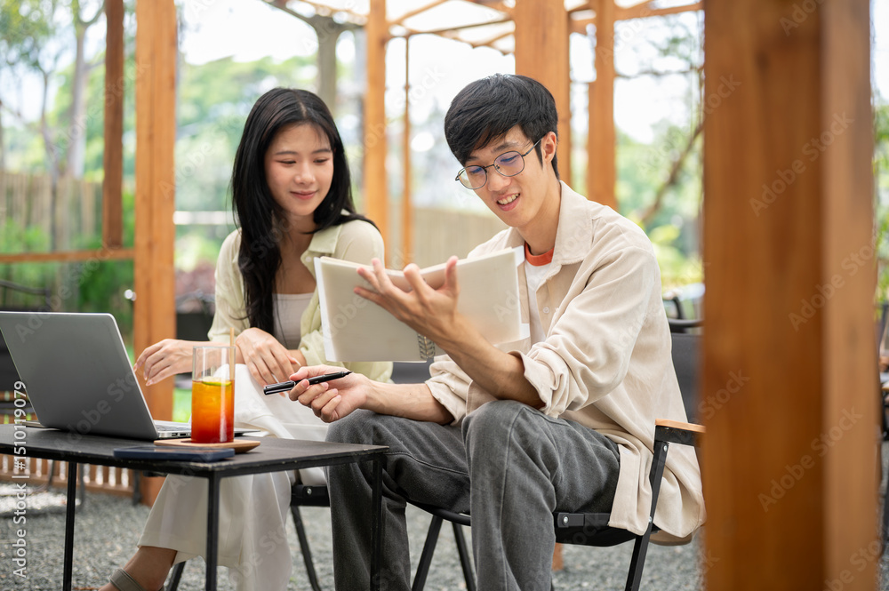 Asian man wearing glasses is smiling while reading a notebook with female friend in garden cafe.