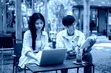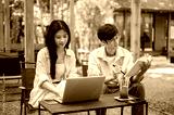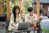 Asian woman looking at laptop sitting with a man wearing glasses reading a notebook at folding table