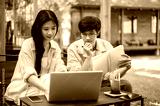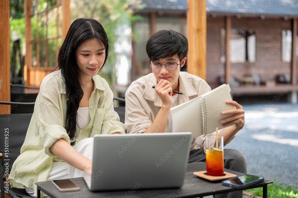 Asian woman is showing datas on laptop screen to a man holding a pen while sitting at folding table.