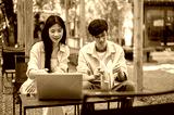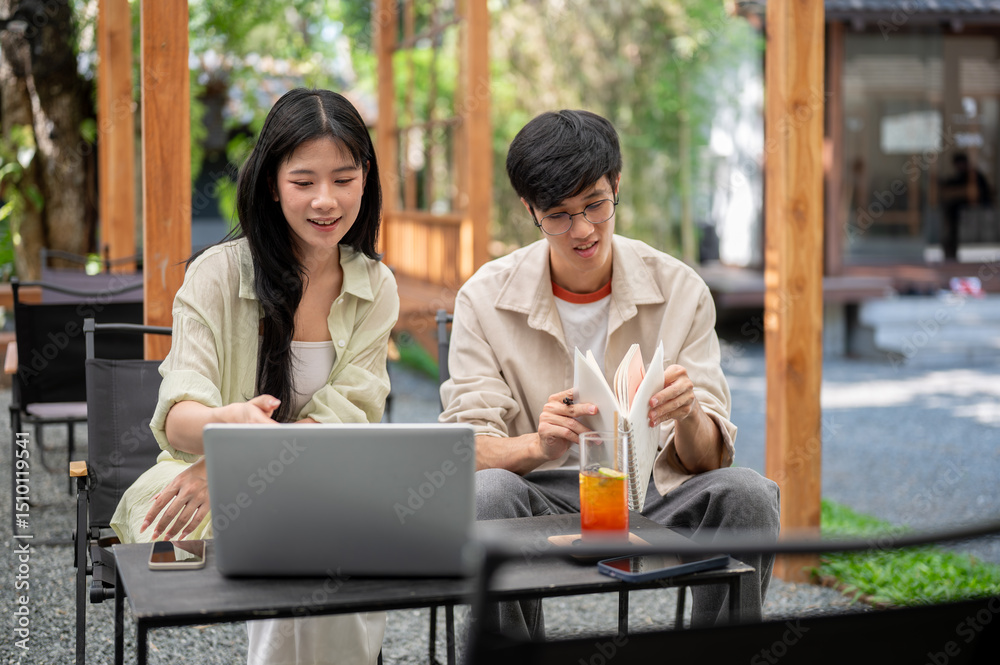 Asian woman is looking at her laptop screen while a man reading a notebook sitting at folding table.