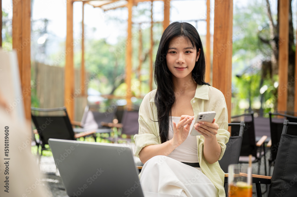 Long hair asian woman looking away from smartphone in hand while sitting on folding chair in cafe