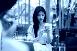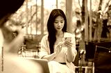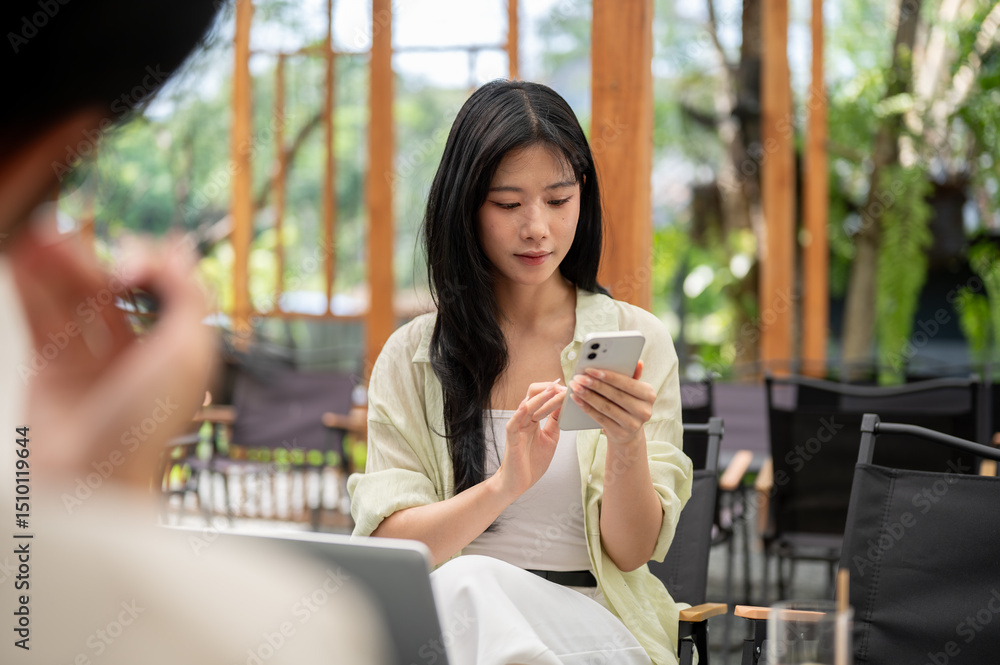Long hair asian woman is holding a smartphone reading chats while sitting on folding chair in cafe.