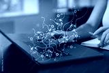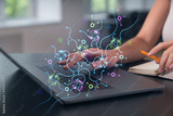 Woman typing on laptop at office workplace in background. Concept of working process, internet surfing, online business education. Student send e-mail. Close up view. Ai icons