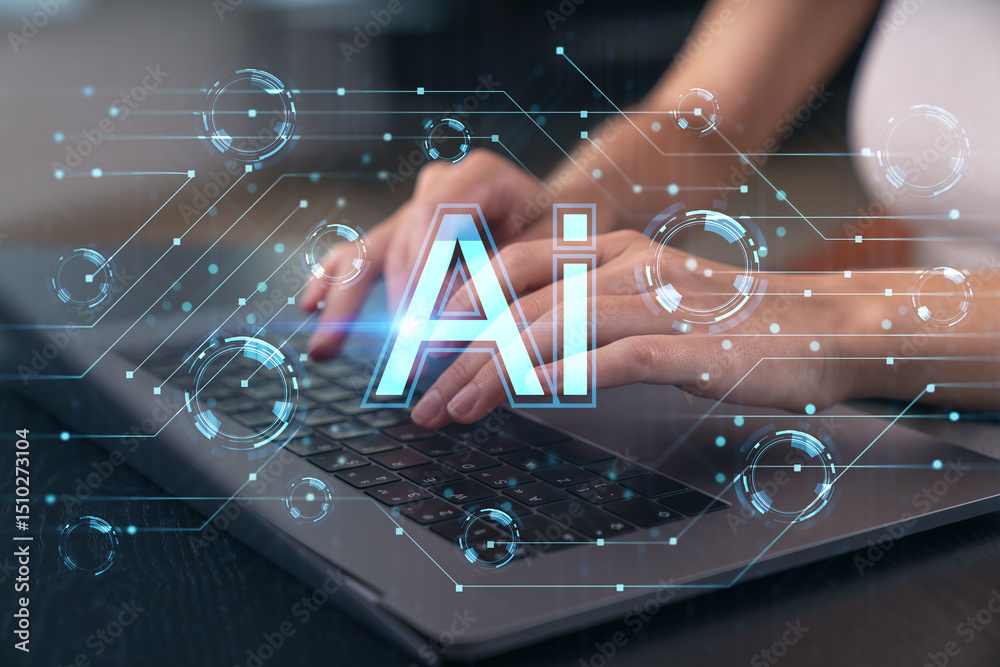 Woman typing on laptop at office workplace in background. Concept of working process, internet surfing, online business education. Student send e-mail. Close up view. Ai icons