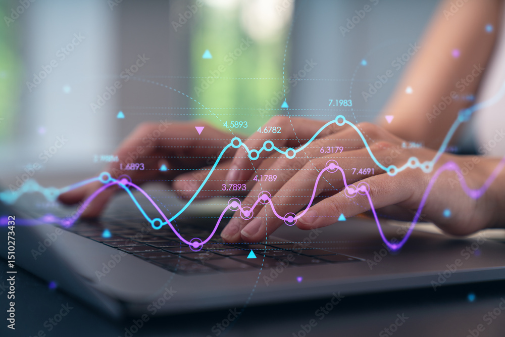 Woman typing on laptop at office workplace in background. Concept of working process, internet surfing, online business education. Student send e-mail. Close up view. forex graph and charts