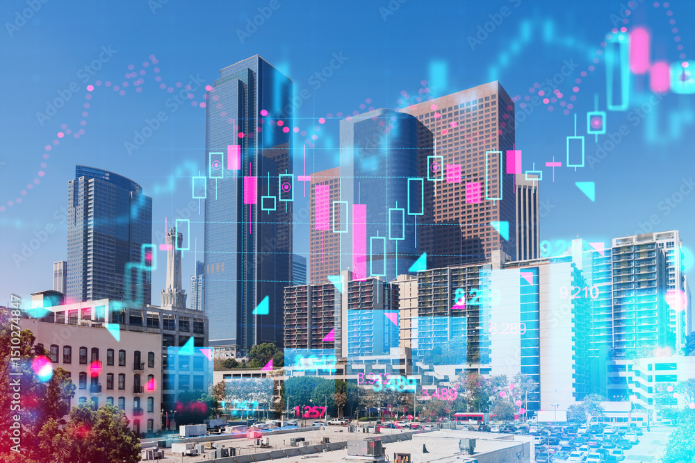 Los Angeles skyline with futuristic holographic overlay, Photo, daytime. Future technology and city concept. Double exposure