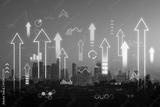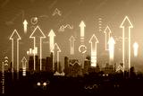 Los Angeles skyline with futuristic hologram graphics overlaid, depicting graphs and symbols. Digital and urban concept with a dusky background. Double exposure