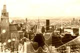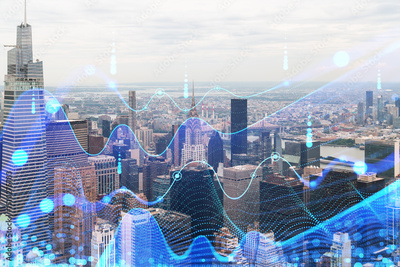 Double exposure of New York City skyline with digital holographic data overlay. Concept of urban technology and business. Double exposure