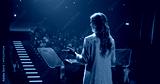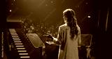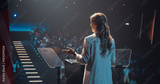 Female Political Party Representative Speaking at a Press Conference in Government Building. Press Officer Delivering a Speech at a Summit. Minister Talking at Congress. Stage with American Flags