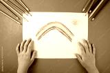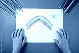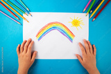 Child's hands coloring a picture of a rainbow with crayons