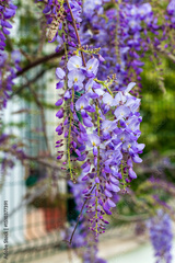 Selective focus of purple flowers Wisteria sinensis or Blue rain, Chinese wisteria is species of flowering plant in the pea family, Its twisting stems and masses of scented flowers in hanging racemes.