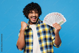 Young happy Indian man he wearing yellow checkered shirt casual clothes hold in hand fan of cash money in dollar banknotes do winner gesture isolated on plain blue cyan background. Lifestyle concept.