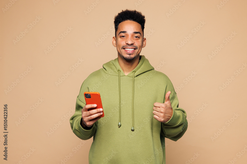 Young man of African American ethnicity wear green hoodie casual clothes hold in hand use mobile cell phone show thumb up isolated on plain pastel beige background studio portrait. Lifestyle concept.